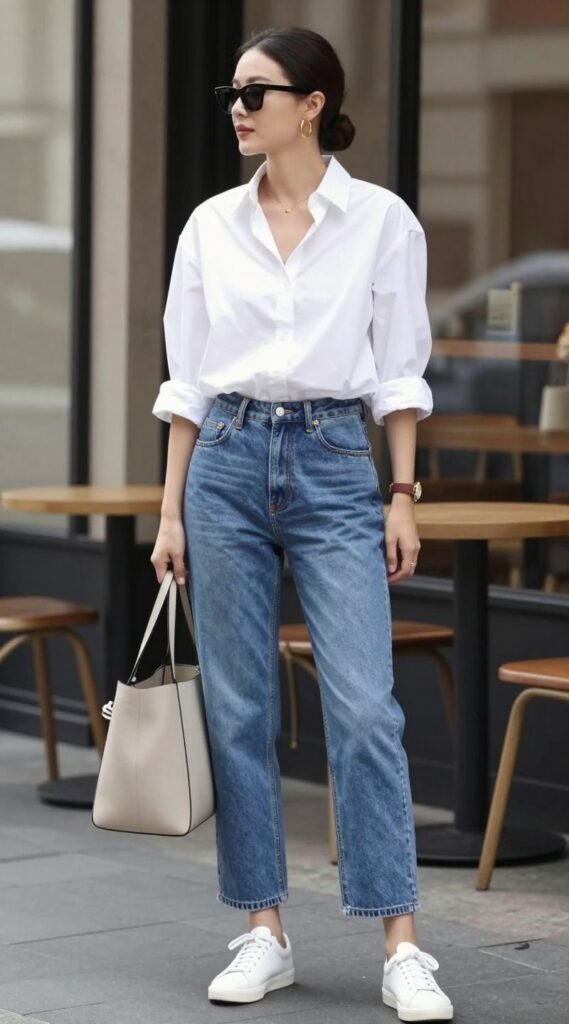 When in doubt, go classic: blue mom jeans plus a white button-down. It looks clean, effortless, and expensive—even if the shirt came from the sale section.